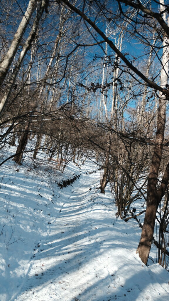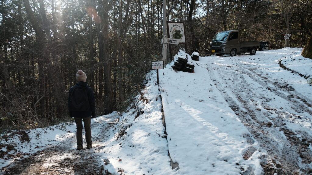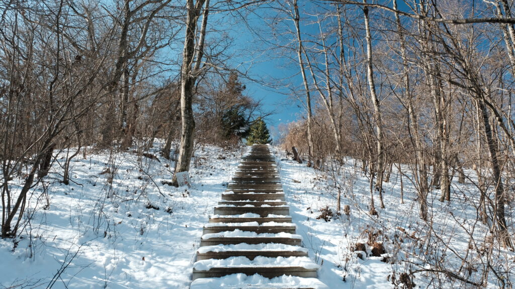 1月2日に降った雪がまだ残っていて凍っている箇所があるという情報を得たので、今回は直登コースの階段をやめて巻き道コースを選びました。