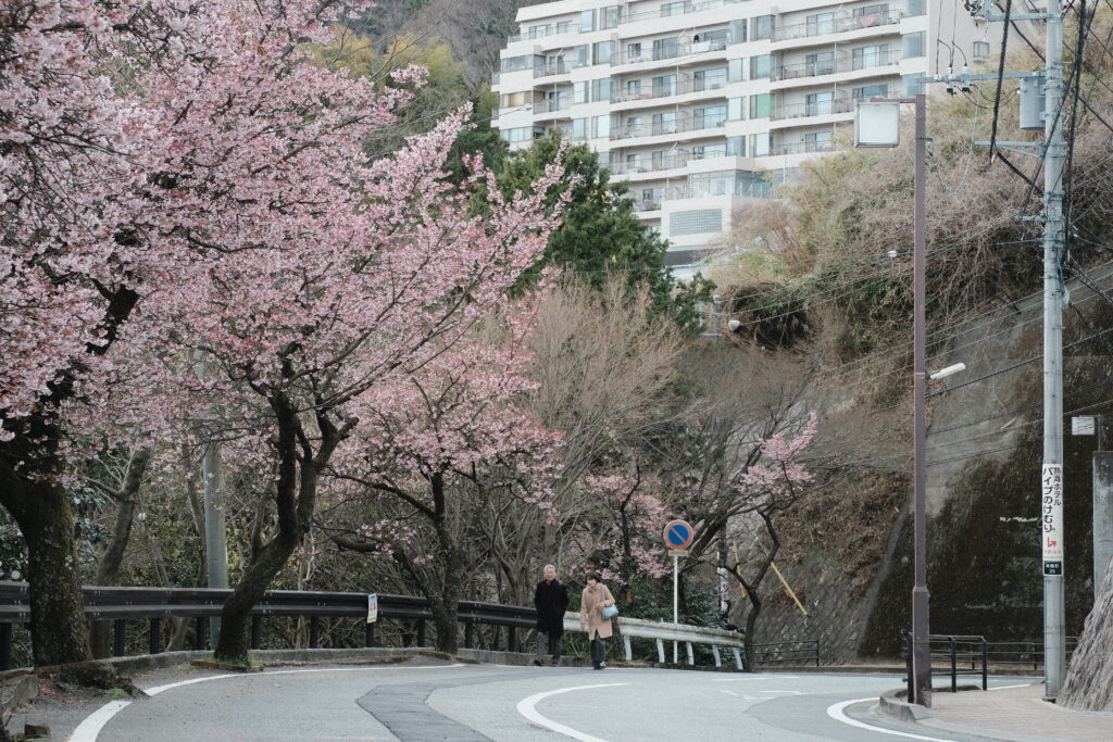 彩度を抑え、粒状感を加えることで、熱海のレトロな街並みがより情緒的に仕上がります。特に「あたみ桜」のピンクが派手になりすぎず、大人のスナップとして落ち着いたトーンで記録できました。