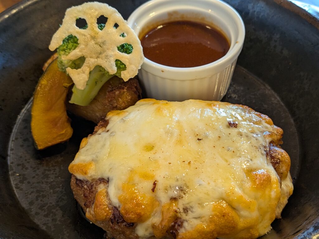 熱々の鉄板の上で音を立てるハンバーグに、たっぷりのチーズがとろりと溶けています。 ナイフを入れると、中から透明な肉汁がじゅわっと溢れ出し、濃厚なデミグラスソースと混ざり合います。