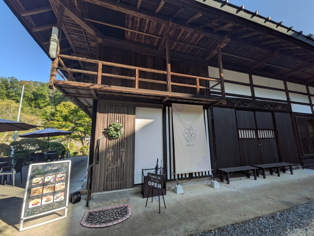 今回のお目当てである「寺カフェ 樹楽寺巣」は、なんとこのお寺の境内にあるんです。お寺でランチと聞くと少し緊張するかもしれませんが、入り口には可愛らしい看板もあり、ウェルカムな雰囲気が漂っています。登山の余韻に浸りながらドライブをして、ちょうどお昼時に到着するのにぴったりの距離感です。