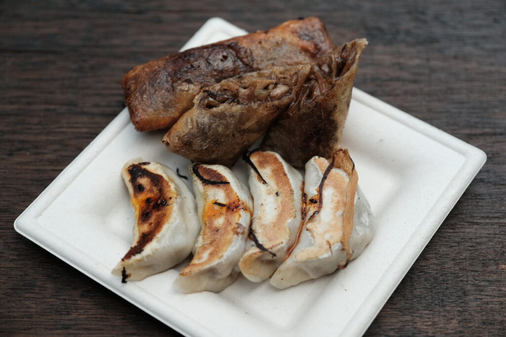 味付きの餃子に特性ラー油をかけて食べるスタイル。一緒に舞茸春巻きもいただきました。