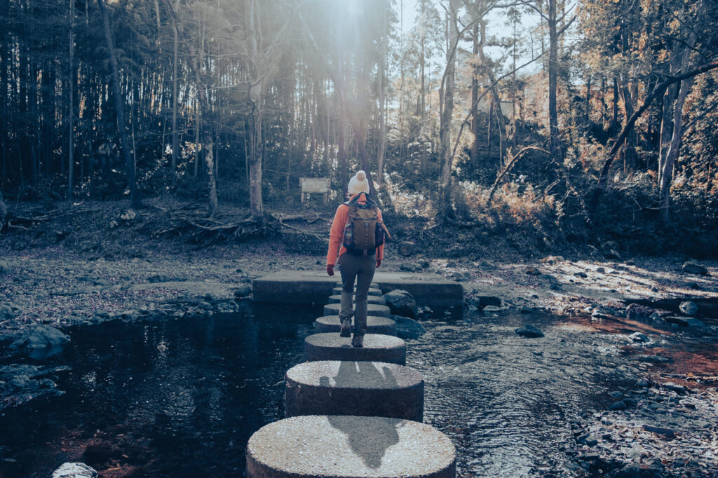 山を下りた後は、入間川の清流沿いを歩く「吾妻峡(あずまきょう)」へ。 山の中から一転、川のせせらぎを聞きながらのトレイルは癒やし効果抜群です。特に「ドレミファ橋」などは写真映えスポットとしても人気ですね。
