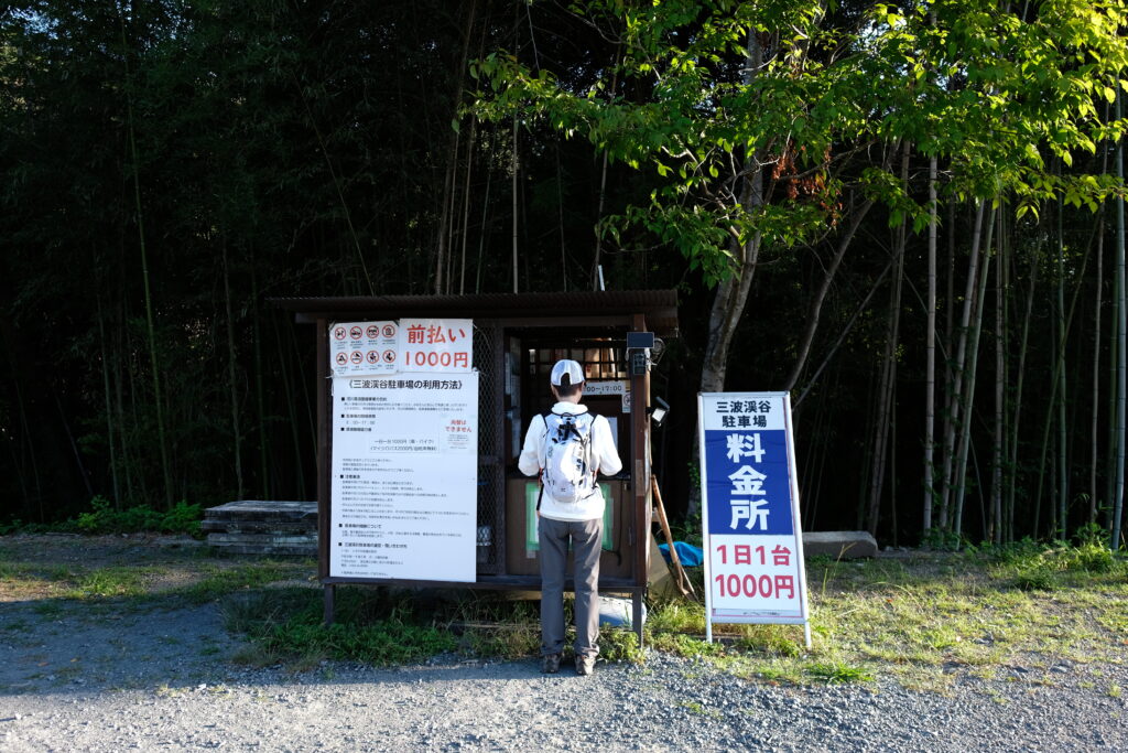 今回は自宅から車で約40分の場所にある弓立山に登ってきました。近くには駐車場が数か所ありましたが私たちは三波渓谷駐車場にとめました。7時現着、平日のためか無人でしたが駐車料金は備え付けの封筒にナンバーを書いて集金BOXに入れればOK。
