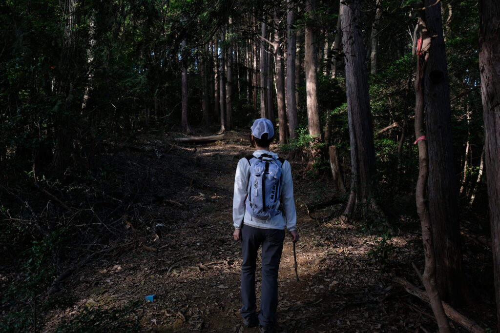 当日この登山道を最初に歩いたのは私達夫婦みたいで蜘蛛の巣が凄いことになっています。最初は私が先頭を歩いていたのですが、あまりにも蜘蛛の巣が多いので心が折れ下山しようと妻に提案したら「私に任せなさい!」と木の枝を持って先頭を歩く妻。杖~妻(笑)